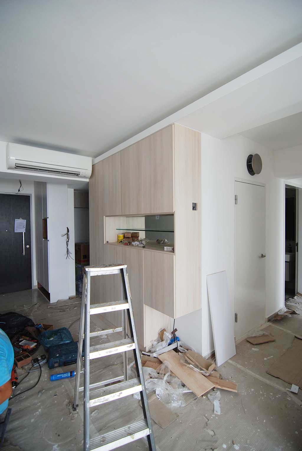 Above: Hubs shifted the plywoood board away and now we can see the wall hung tv console.