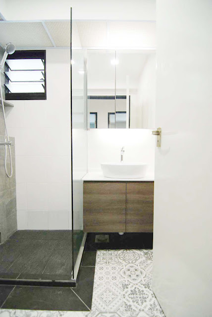 The entrance foyer with seating beach cum shoe cabinet (lourve doors for ventilation). With matching laminate that turns from seating bench up to breakfast countertop. The ventilation blocks and pattern tiles lends a vintage vibe, allows partial views into the kitchen and bringing natural daylight further into other spaces.